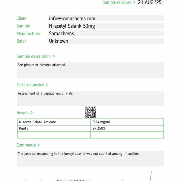 - What We Offer: Our N-Acetyl-Selank spray is lab-tested for purity and effectiveness, ensuring you receive a premium product.